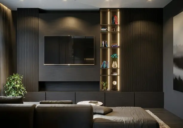 - تركيب خلفية شاشة تلفزيون مع إضاءة مخفية وصناديق تخزين صغيرة.